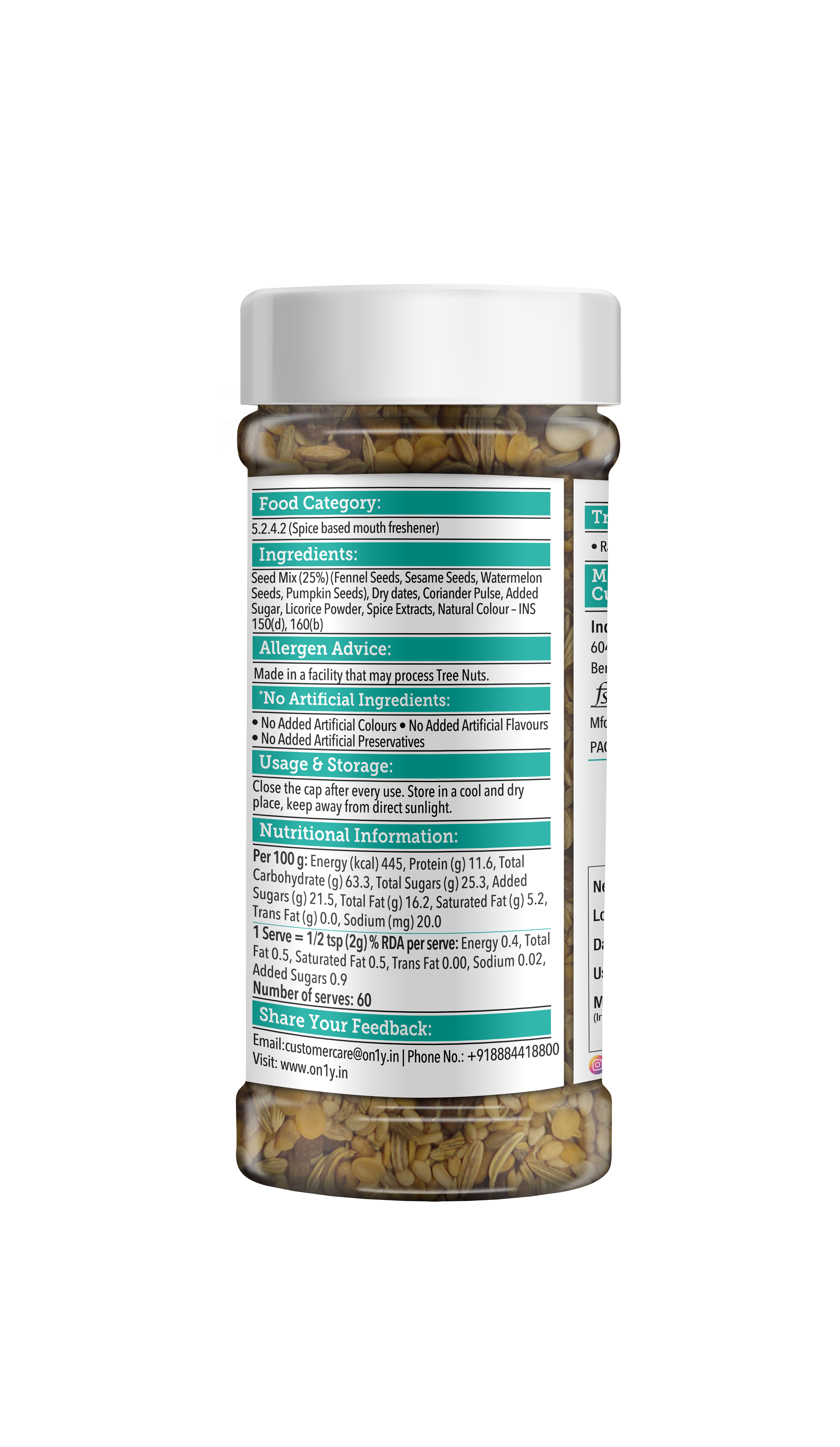 Seed mix (25%), (Fennel seeds, Sesame seeds, Watermelon Seeds, Pumpkin Seeds), dry dates, Coriander Pulse, Added sugar, Licorice powder, spice extracts, Natural Colour – INS 150(d),160 (b).